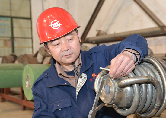 2010年,陸勝祥班組接受了一項氣化爐燒嘴技術改進的任務,當時淮化既沒有專業的機械設計人員,也沒有工藝設計圖紙,只有一份根據廠家描述畫出來的多元料漿燒嘴總裝示意圖。關鍵時刻,淮化集團又一次將技改的重任交給了陸勝祥。經過七天七夜的努力,他不負眾望圓滿完成了繪圖、工器具制作、內噴頭光刀改造任務。最終,第一臺氣化爐多元料漿燒嘴技改成功,不僅實現了裝置的穩定運行,也實現了合成氨廠燒嘴連續運行119天的新歷史。